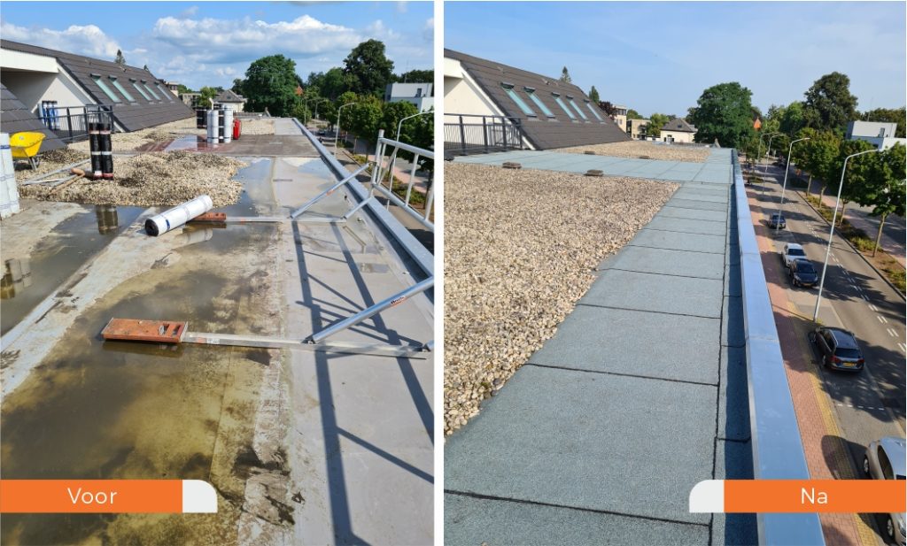 Voor EcoBright in Doetinchem hebben wij van het totale dak de PVC dakbedekking vervangen door bitumen dakbedekking van het merk Soprema. De randen zijn voorzien van zinken afdekkappen.
