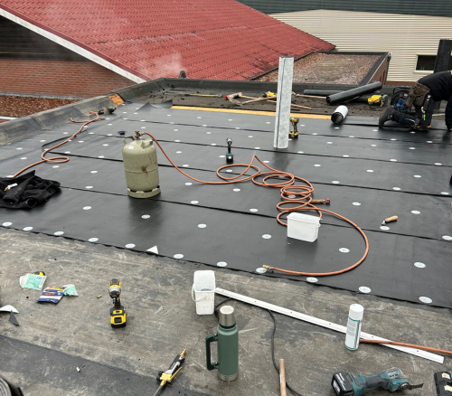 De oude dakbedekking en het aangetaste dakbeschot zijn volledig verwijderd. Waar nodig is de onderconstructie hersteld en zijn nieuwe OSB-platen aangebracht als stevige en vlakke onderlaag. Vervolgens is een dampremmend onderdoek mechanisch bevestigd, waarna de bitumen dakbanen laag voor laag thermisch zijn verwerkt. De dakranden zijn afgewerkt met aluminium randprofielen voor een strakke en waterdichte afsluiting. Alle doorvoeren en opstanden zijn zorgvuldig ingepakt en afgedicht.