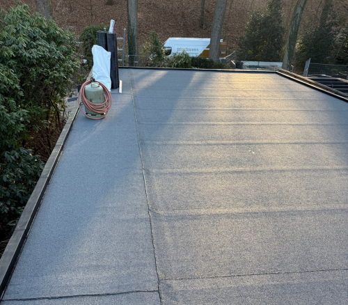 De oude dakbedekking is volledig verwijderd en het dakoppervlak is grondig voorbereid. Vervolgens is een nieuw dampremmend onderdoek aangebracht als basis voor de nieuwe opbouw. De bitumen dakbedekking is vakkundig in meerdere lagen aangebracht en thermisch verwerkt met een gasbrander. Bijzondere aandacht ging uit naar de afwerking rondom de dakdoorvoeren en opstanden, zodat het geheel volledig waterdicht is afgesloten.