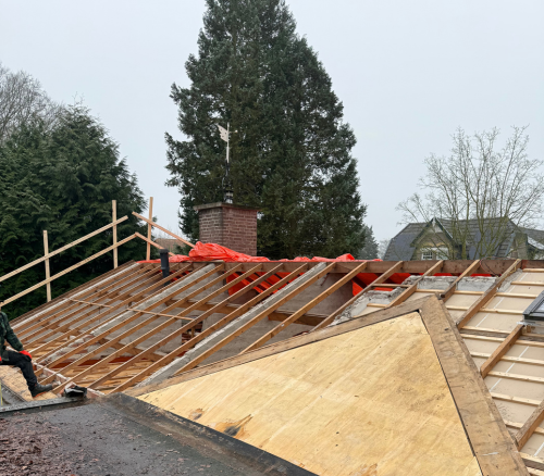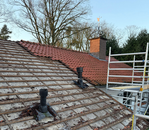Het gehele dak is ontdekt: alle pannen en het oude dakbeschot zijn verwijderd. Vervolgens is nieuw OSB-beschot aangebracht als stevige basis, gevolgd door een hoogwaardig onderdoek. De nieuwe dakpannen zijn rij voor rij zorgvuldig gelegd en verankerd, inclusief nette afwerking van de nokken, killen en de schoorsteen. De dakkapel en geveldelen zijn meegenomen in de algehele afwerking voor een strak geheel.