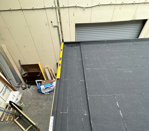 Op de prefab dakconstructie is stap voor stap een nieuwe dakopbouw gerealiseerd. Eerst is een dampremmend onderdoek mechanisch bevestigd als hechte onderlaag. Vervolgens zijn de bitumen dakbanen zorgvuldig aangebracht en thermisch verwerkt. De afwerking rondom de opstanden, dakranden en doorvoeren — waaronder de ventilatiepijpen — is nauwkeurig uitgevoerd om elke kans op lekkage uit te sluiten. De strakke randen zijn afgewerkt met een duurzaam randprofiel passend op de prefab constructie.