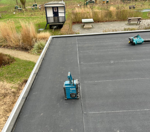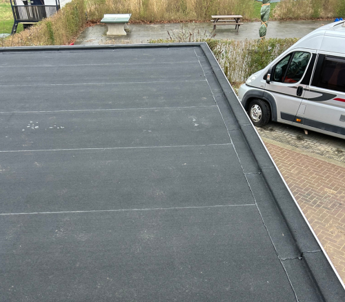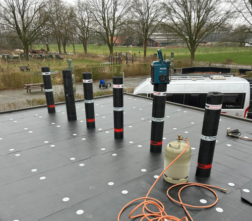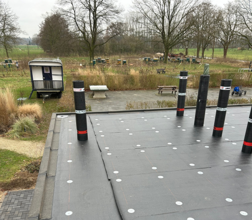 Op het bestaande dakoppervlak is een nieuwe opbouw aangebracht met IKO dakbedekking. Het onderdoek is mechanisch bevestigd en de dakbanen zijn thermisch verwerkt over het volledige dakoppervlak. Bijzondere aandacht ging uit naar de tientallen doorvoerpijpen: elke pijp is individueel omgekraagd en waterdicht ingepakt met bitumen manchetten, zodat het dak rondom alle installaties volledig gesloten is. De dakranden zijn strak afgewerkt voor een duurzame en windvaste afsluiting.